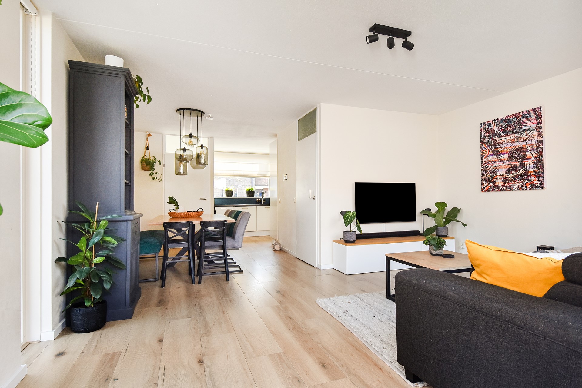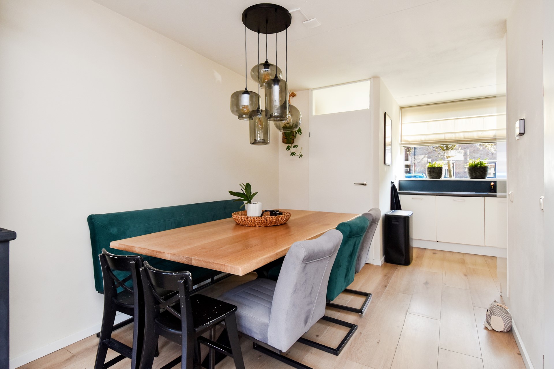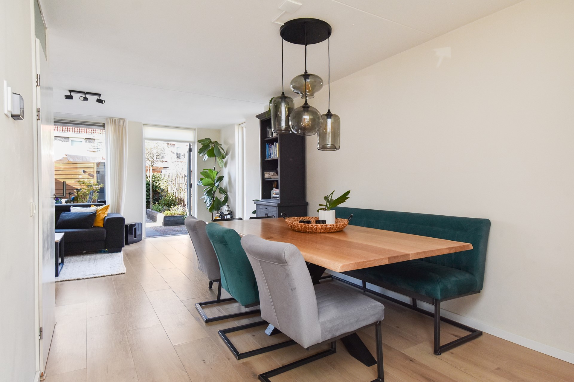 De tuingerichte woonkamer is heerlijk licht, voorzien van een moderne laminaatvloer. Vanuit de woonkamer met extra raampartijen aan de zijkant heb je toegang tot de zonnige achtertuin met vrijstaande houten berging en achterom.