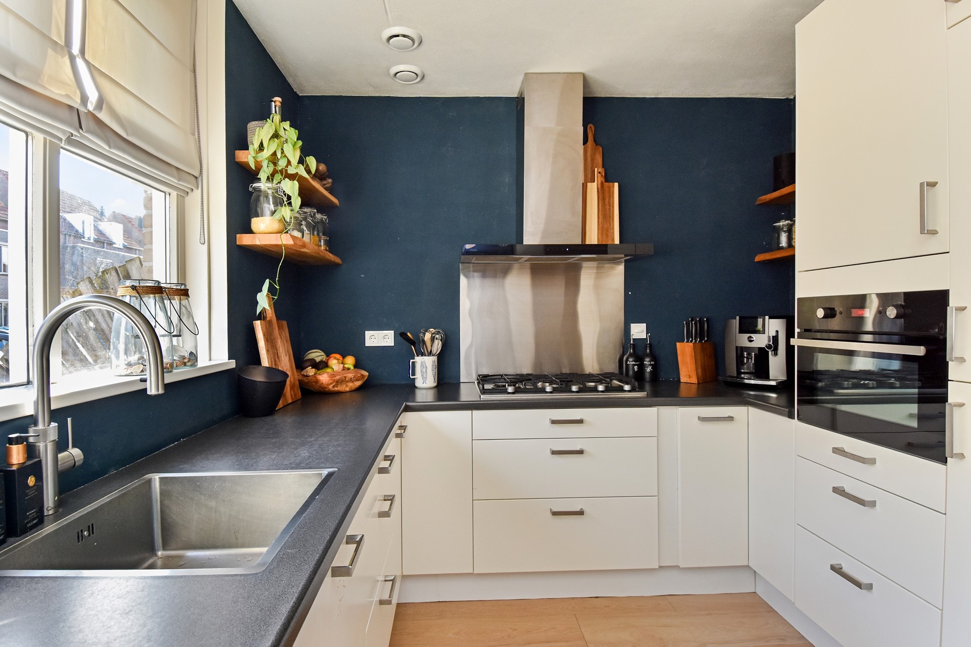 Aan de voorzijde bevindt zich de halfopen keuken in praktische U-opstelling. De keuken is uitgerust met diverse inbouwapparatuur, waaronder een vaatwasser, gaskookplaat, afzuigkap, koel-/vriescombinatie en combi oven/magnetron en heetwaterkraan. Daarnaast is er volop werk- en bergruimte aanwezig.