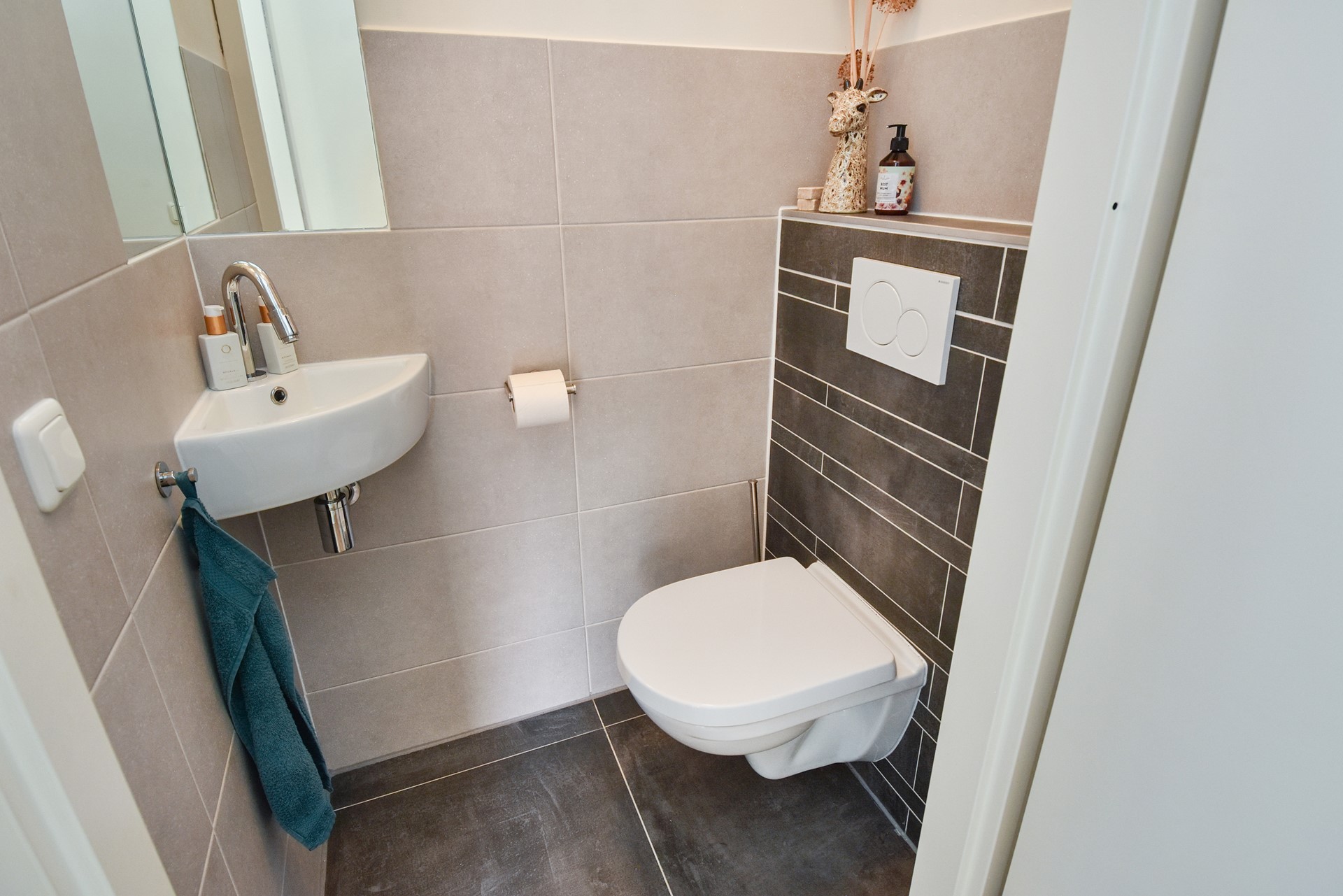 Vanuit de woonkamer bereikt u de toiletruimte met hangend toilet en fontein en de trapopgang naar de 1e verdieping.