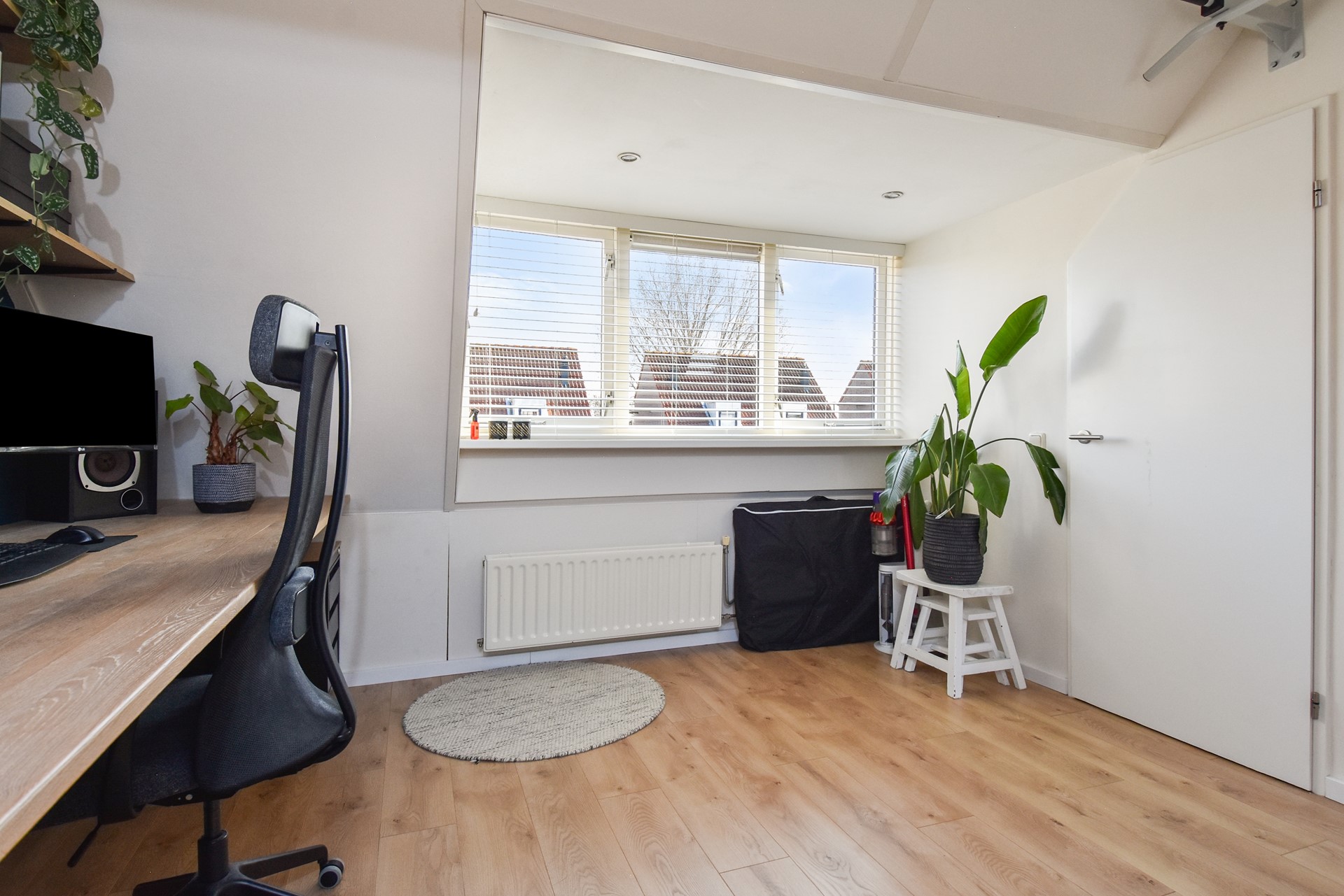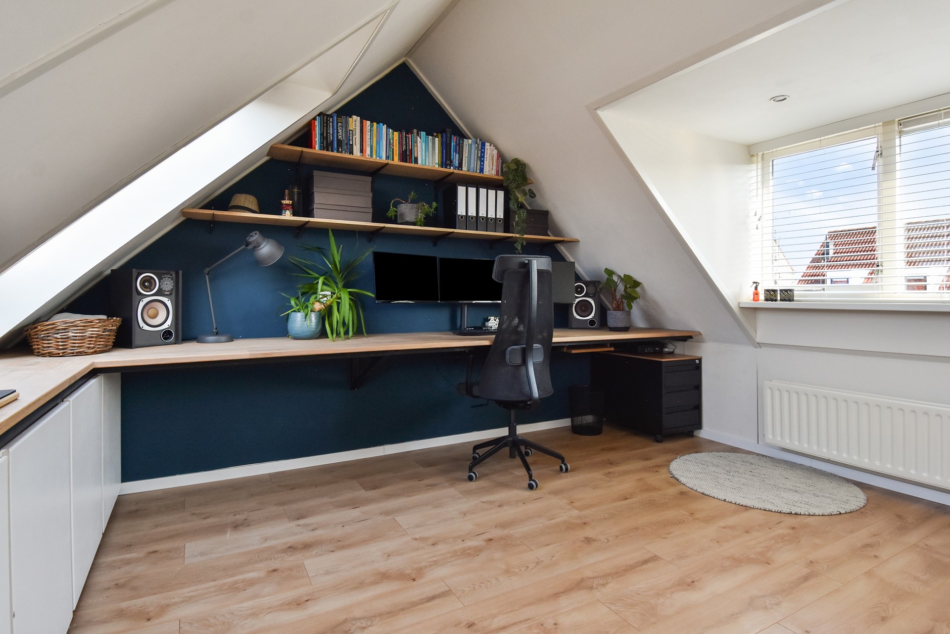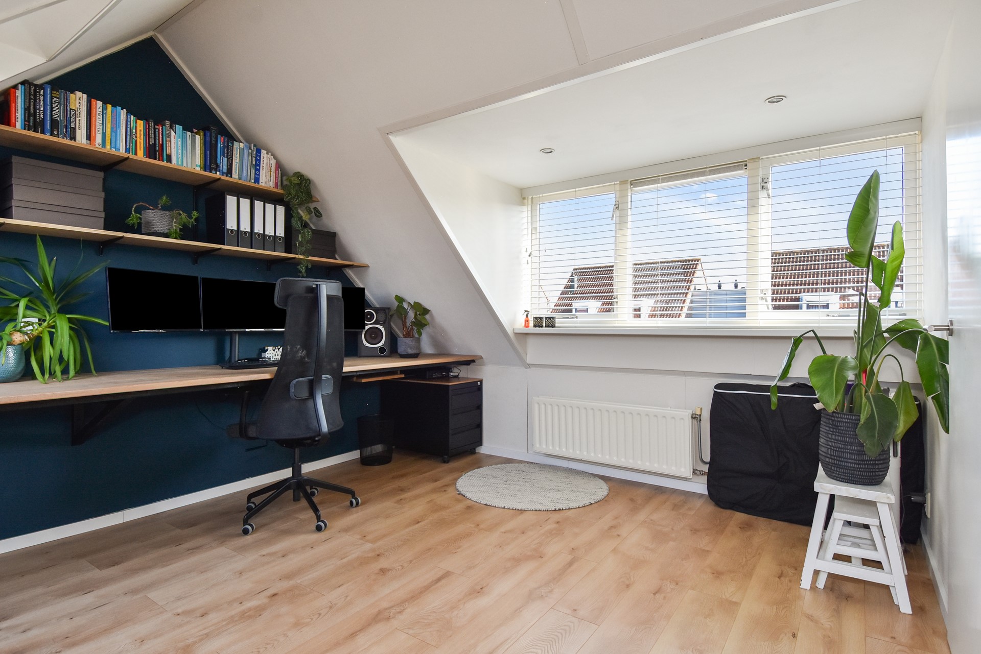 De zolderverdieping biedt een royale goed ingedeelde ruimte met aan de voorzijde een dakkapel en aan de achterzijde dakramen, te gebruiken als slaapkamer, hobby-kamer of werkkamer. Naast de bergruimte achter knieschotten zijn hier praktische extra bergruimtes gecreëerd. In een afgesloten ruimte is de opstelplaats voor de Intergas cv-ketel (2025) en aansluiting voor de wasmachine.