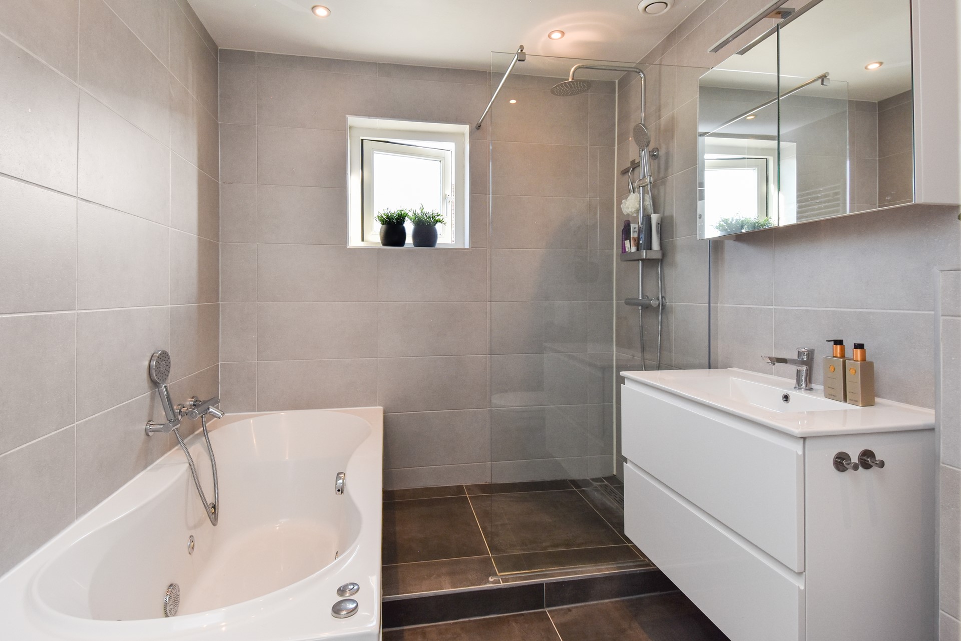 De volledig betegelde badkamer is uitgevoerd met een ligbad met whirlpool, inloopdouche, wastafel met meubel, tweede hangend toilet en designradiator.